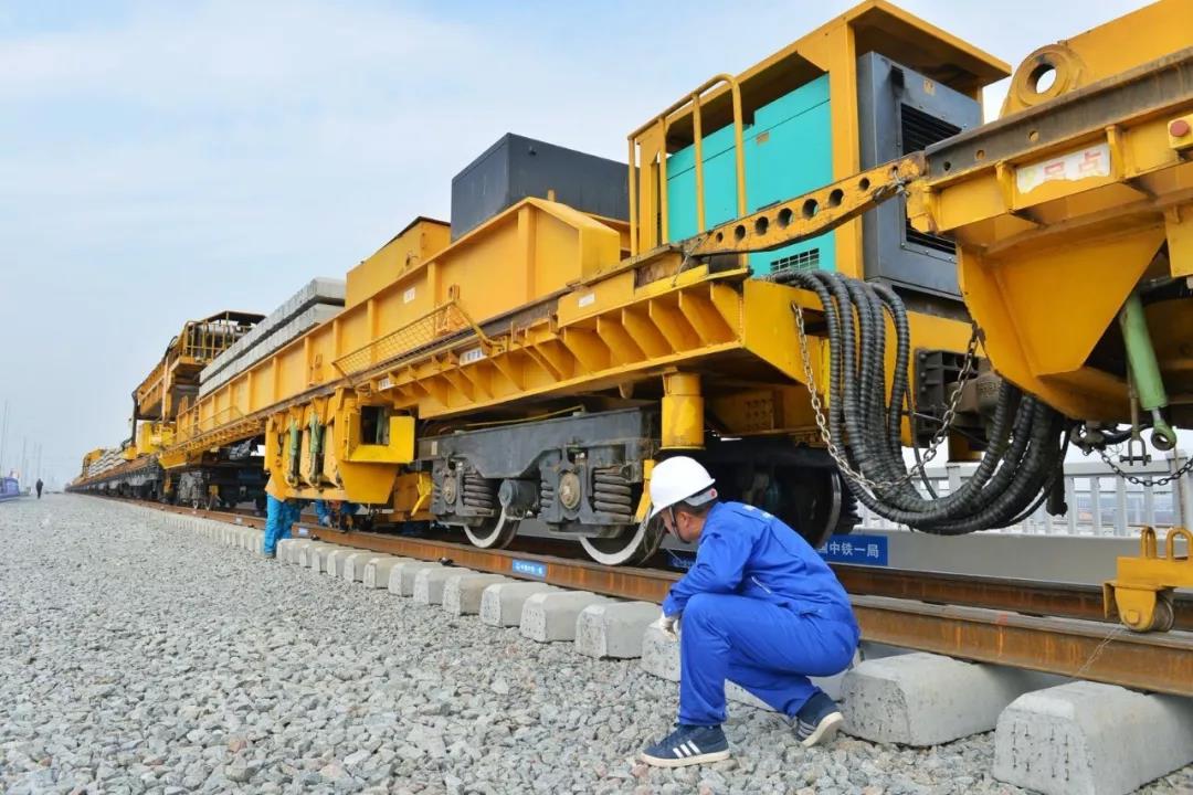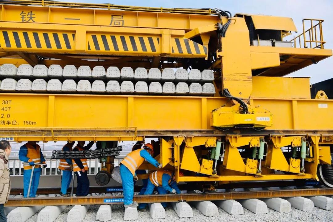 有砟铺轨采用国内最先进的CPG500型铺轨机组,可一次性铺设500米长钢轨,具有机械化程度高、连续作业时间长、功效指标高等优点,可实现钢轨铺设与轨枕布设同步机械化施工。与传统的“换铺法”铺设一对500米长钢轨大约需要12小时相比,因为减少了轨排组装、换轨、回收工具轨等诸多工序,仅需90分钟即可完成,单次铺轨成形最长可达2.5公里,大大提高了施工效率。